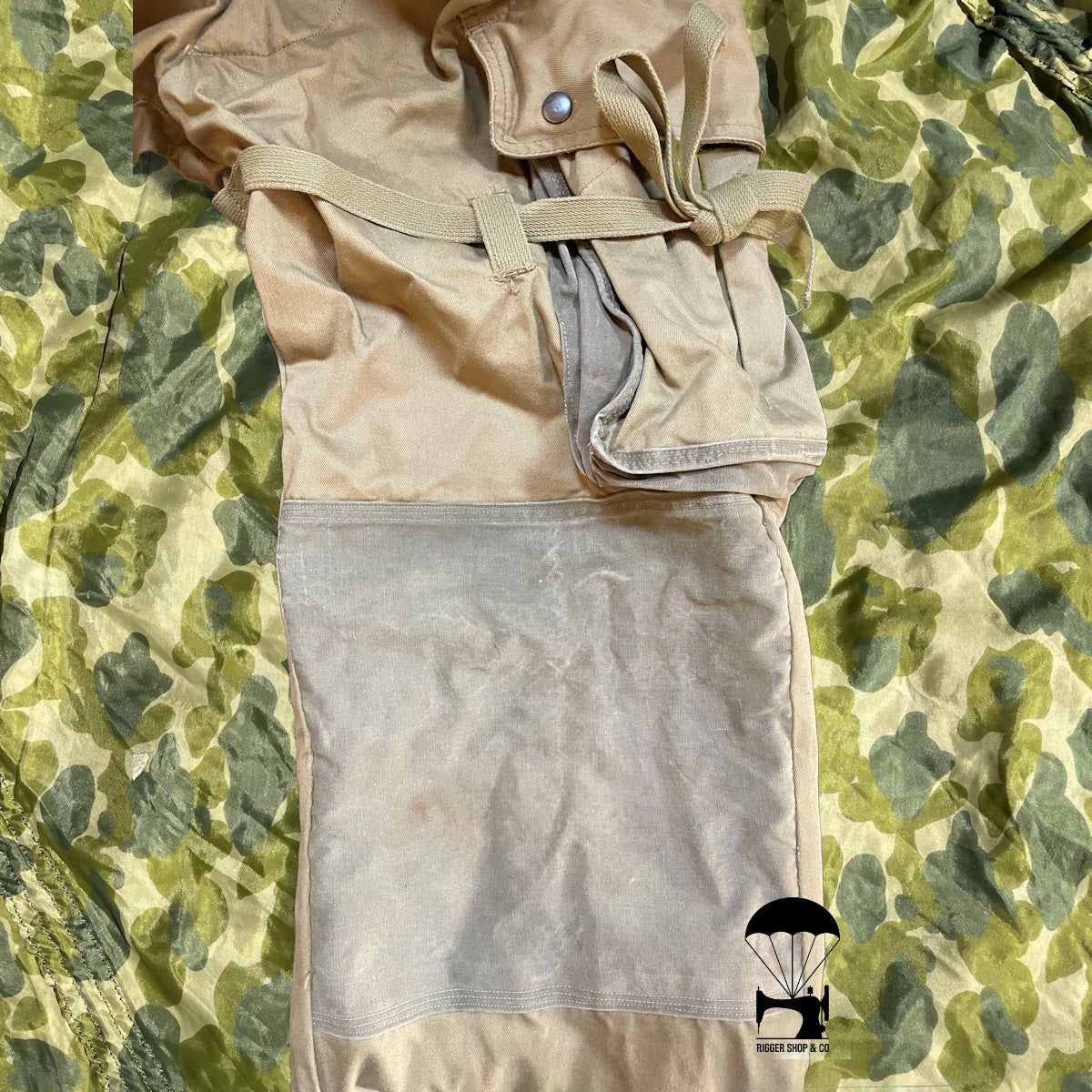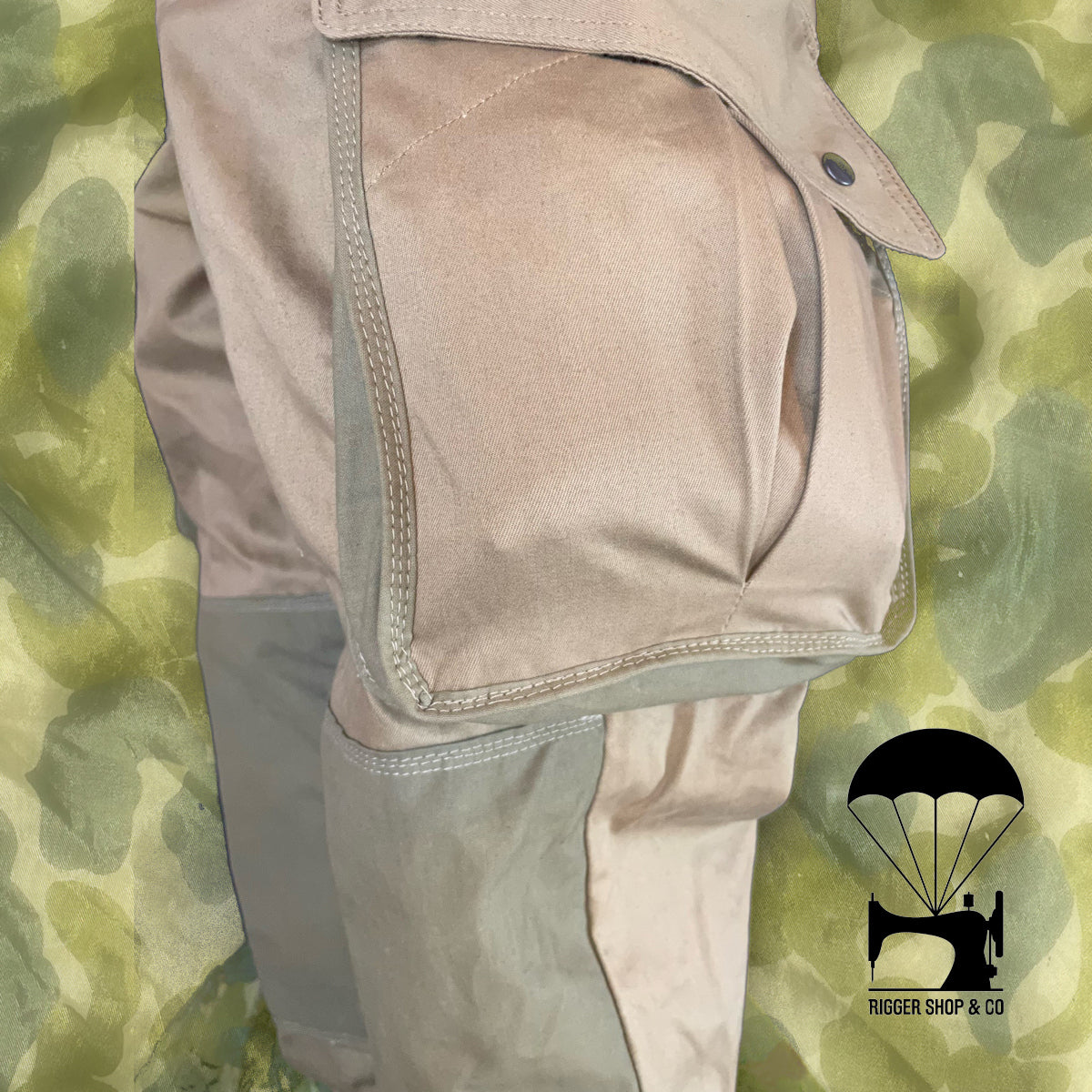 Chaque pièce est modifiée à la main selon les pratiques des riggers parachutistes de 1944 : renforts sur les genoux, les poches, avec des coutures volontairement irrégulières mais solides, comme observé sur les exemplaires exposés dans les musées.